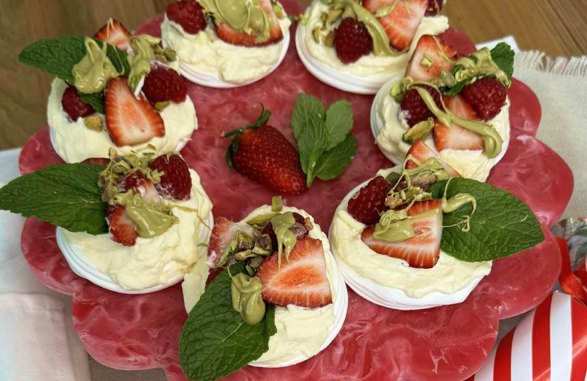 The baked brie is warm and gooey and the pistachio berry pavlova is a twist on a classic that will have everyone asking for the recipe.